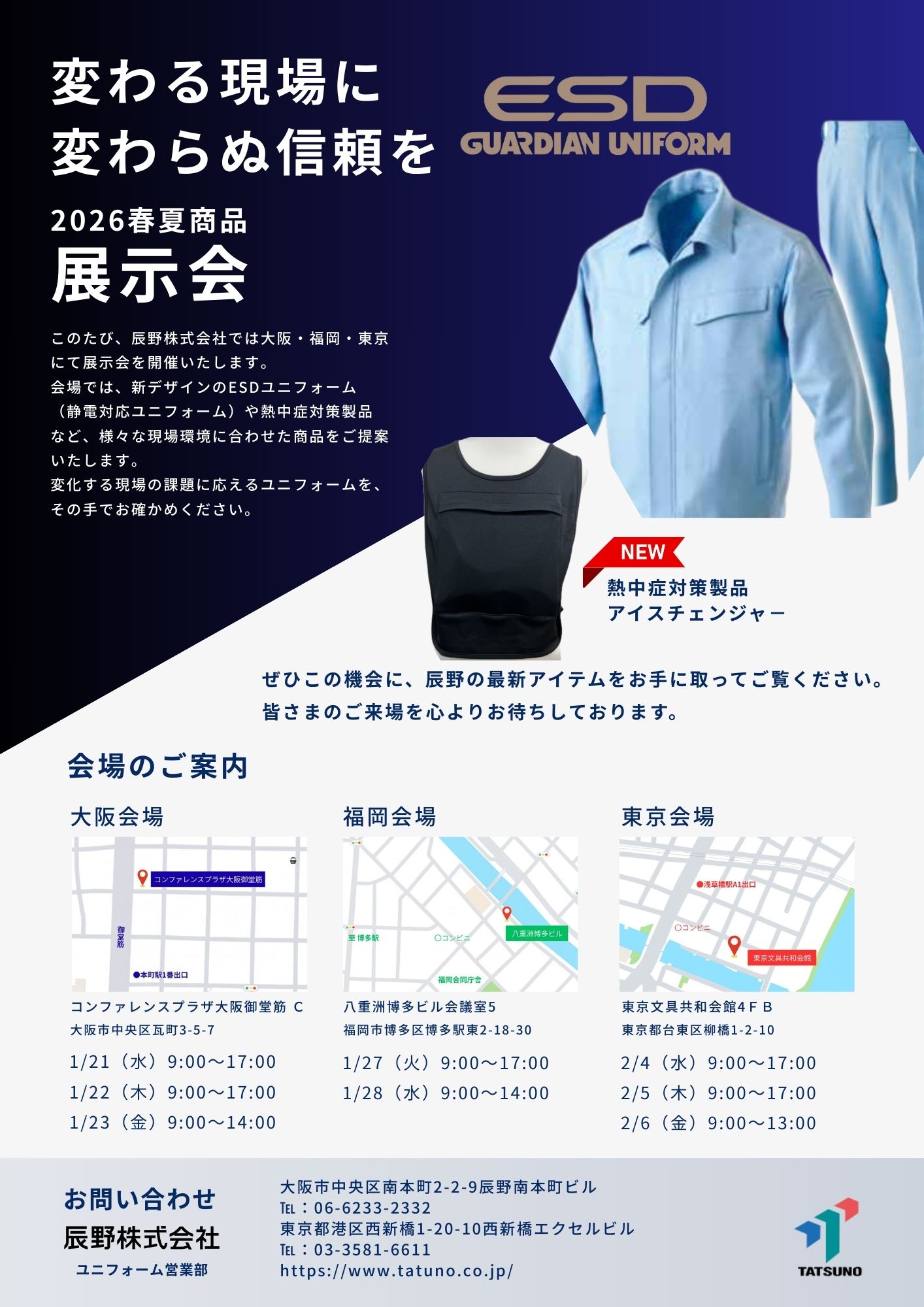「ESDユニフォーム」の展示会を開催いたします(大阪・福岡・東京)